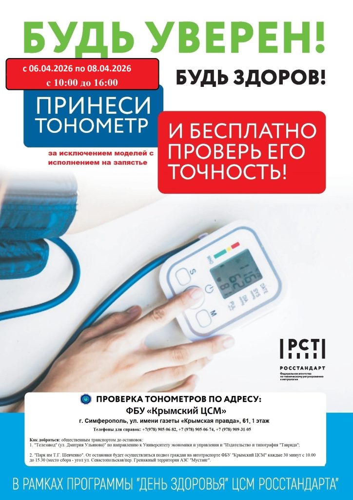 В дни Акции специалисты ЦСМ Росстандарта в Республике Крым на безвозмездной основе будут вести прием граждан для проведения контроля выходных параметров бытовых тонометров артериального давления, используемых населением, а также дадут рекомендации по дальнейшему использованию оборудования.
